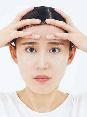 疲れている印象や老けた印象を与えやすい、笑いジワを薄くする効果のあるエクササイズです。目の周りの「眼輪筋(がんりんきん)」や「眼窩部(がんかぶ)」を鍛え、額の筋肉を使わずに目を開く練習をすることで血流を良くし、目の周りや額の不自然なシワを薄くしていきます。