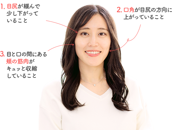 コミュニケーションにおいて相手に好印象を与える笑顔とは、顔全体を使って笑っている自然な笑顔のことです。自然な笑顔のポイントは次の3つです。