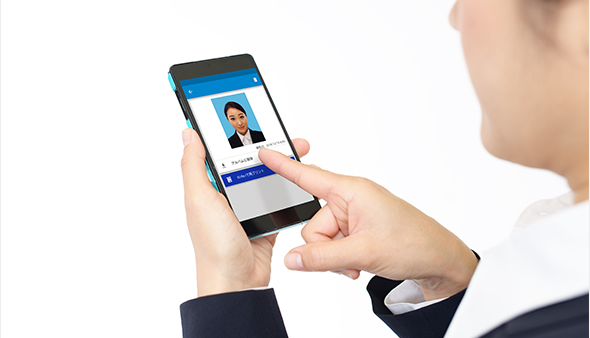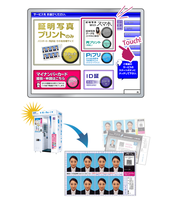 「Ki-Re-i」で「証明写真データWithスマホ」を選択して写真撮影。印刷されたQRコード付きの写真を受け取ります
